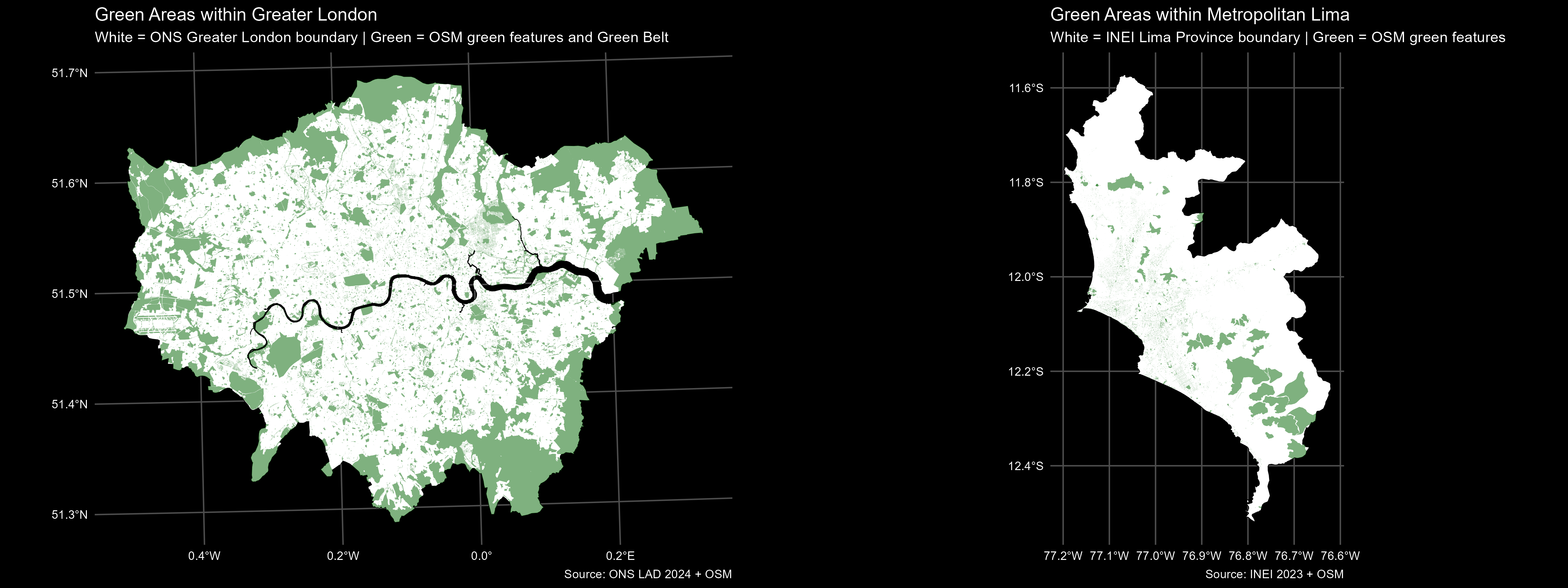 Beyond the numbers, visualising the spatial distribution of green spaces reveals the story more powerfully. While Greater London benefits from a wide network of parks, woodlands, and the surrounding Green Belt, Lima’s pattern highlights the urban and social challenges of providing equitable access to nature in a rapidly expanding metropolis.